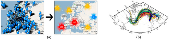 Density-map visualizations of traffic trajectory data (a) composite density map of vessel-accident risks [42]; and (b) density map combined with a particle system [43].