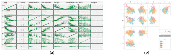 - Chen, H.; Engle, S.; Joshi, A.; Ragan, E.D.; Yuksel, B.F.; Harrison, L. Using animation to alleviate overdraw in multiclass scatterplot matrices. In Proceedings of the 2018 CHI Conference on Human Factors in Computing Systems, Montreal, QC, Canada, 21–26 April 2018; pp. 1–12. [Google Scholar]