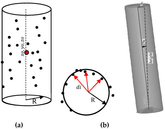 Therefore, the objective function is to minimize the difference between the distances from the fitting points to the cylinder axis and its radius R as illustrated in Figure 2.