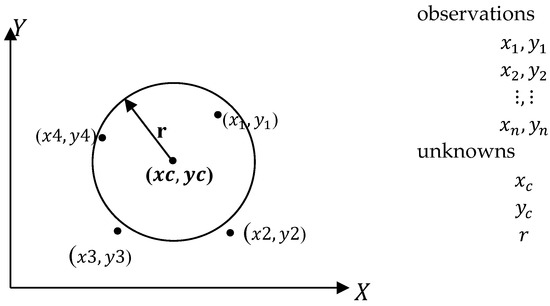 The least squares adjustment of a circle best fit in a 2D space is shown in Figure 5 as follows:
