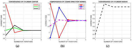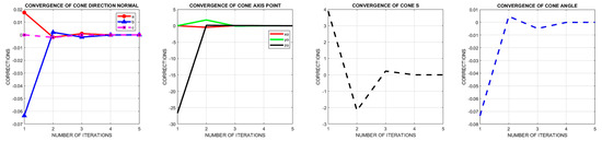 As mentioned, a geometric cylinder and cone fitting is applied to the minaret point cloud to estimate the out of plumb of the minaret axis. Figure 9c shows the best fitting cylinder, and in Figure 9d, the best fitting cylinder is fused with the minaret point cloud. Using the formulas in Section 2.1, the least squares solution is converged to optimal values (Figure 10).