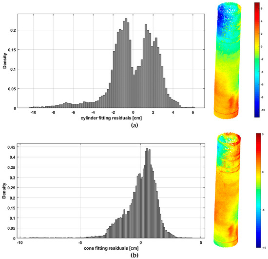 Cylindrical and conical geometric primitive fitting results. (a) The distance between the point cloud and the best fit cylinder surface (σ = ±2.3 cm). (b) The distance between the point cloud and the best fit conic surface (σ = ±1.4 cm).
