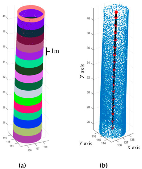 Multi cylinder primitive fitting results of the shrine minaret. (a) The cylindrical minaret body is divided into multiple 1 m sections. (b) The barycentric coordinates at each height level is computed through a cylinder fitting.