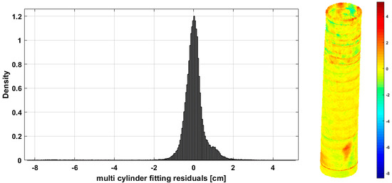 As previously stated, Table 3 shows that the radius of the cylindrical minaret tower decreases from bottom to top, and fitting the whole minaret body with one cylinder or cone would not be so accurate. Similar to Figure 11, the multi cylinder fitting is evaluated by computing the distances between the point cloud and the fitting cylinders. Then the standard deviation of 1σ is computed as ±0.8 cm, indicating the high precision of the multi cylinder fitting to the point cloud, as shown in Figure 13.