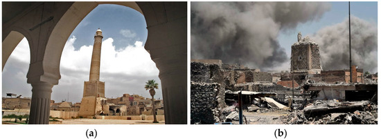 Al-Nuri Grand Mosque in the Old City of Mosul, Iraq. (a) before destruction. (b) after destruction [27].