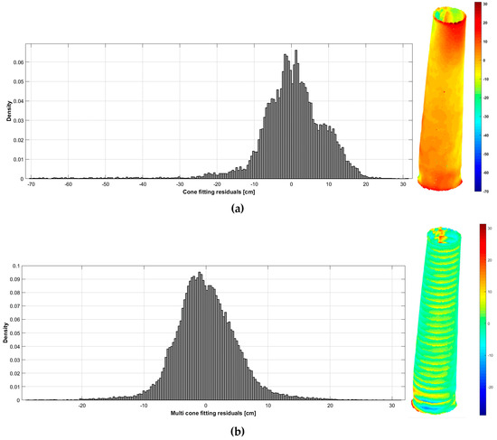 To evaluate the goodness of the primitive fitting, we compute the distance between every point and the cone surface. The results are shown in Figure 18a, where the median of the residuals between the cone surface and the points is −27 cm and the standard deviation is ±9.7 cm of 1σ.