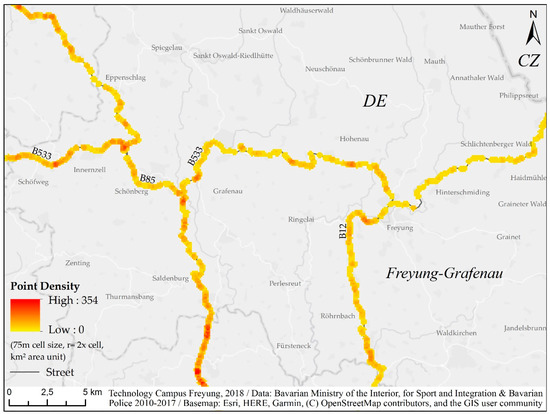 During the past eight years, Bavarian police recorded all reported WVCs, georeferenced the location of the accidents, and documented the species of the animal involved in the accident. We used an excerpt of this dataset for the district of Freyung-Grafenau, a rural accident hotspot in the Bavarian Forest, Germany (Figure 1). The dataset contains 1571 accidents within the period of 2010–2017 at secondary roads. As a lot of WVCs occur at overland roads of the secondary street class, we have chosen a dataset with all three secondary roads B 12, B 85, and B 533 (national roads—Bundesstrasse) for the analysis. To identify the relevant roadside infrastructure, we used 5596 images recorded by camera-based inspections along the road, data from official road inspections from the Bavarian Ministry of the Interior, for Building and Transport of the year 2015. While WVC data covers a period of the past eight years, the barrier information is, due to the photo material, only a snapshot of the situation in 2015. However, we assume that the changes in this type of infrastructure are minor and will not have significant impact on the analysis.