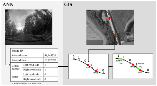 In this study, we analyzed the impact of barriers (crash barriers and fences) on the risk of WVCs. We followed the hypothesis that (1) crash barriers and fences can be identified in a series of camera-based road inspection images by an ANN and that (2) a georeferenced inventory of fences and barriers can be built using GIS. Based on this data, we found a preliminary answer to the question of up to which extent barriers can have a preventive measure while influencing animals’ behavior to reduce accidents and increase safety. While a barrier effect of crash barriers is visible, fence impacts must be researched more precisely in the next step. Using ANN to identify barriers in the images provided, in a first attempt, already adequate results, sufficient to delineate barriers in a GIS. GIS was in this part able not only to build the polylines of these structures but also to compensate errors of the ANN by restricting results to a spatially reasonable dataset.
