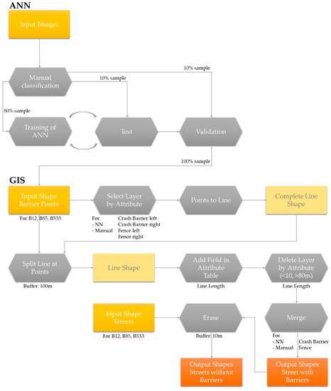 For the investigation, we used information about animal- and human-preserving barriers (crash barriers and fences) derived from an automatized image classification with the TensorFlow framework and a GIS analysis (see Figure 2 for the concept and Figure 3 for the process chain). First, we manually classified all images of the camera inspection. The basic ANN was constructed by using Inception V3 architecture. For the training, the transfer learning approach was used because the set of available data was too small to train an own network. A pre-trained network, based on the ImageNet dataset [27], was taken to support the training work. The output layers were removed, and the network was trained again, using a set of roughly 800 inspection images.