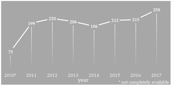 In the district of Freyung-Grafenau, a total of 1571 WVCs occurred on secondary roads in the years 2010–2017. The increase of accidents over the past eight years correlates with the increase of this accident type in Bavaria and Germany (Figure 4).