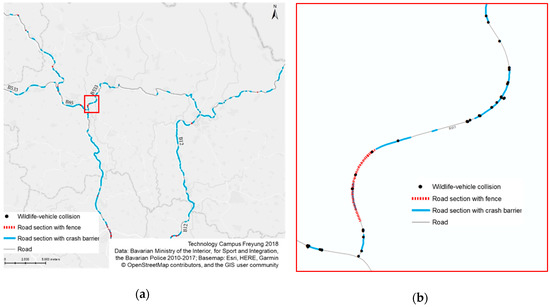 Heterogeneous parameters of the road environment contribute, to a greater or lesser extent, to the cause of wildlife–vehicle collisions (WVCs). Land use, road structure, as well as traffic volume and speed are already explored parameters with a significant impact on WVCs [1,2,3]. One aspect which has been marginally researched is the road accompanying structure. This opens the question up as to what extent the roadside infrastructure, such as crash barriers and fences, affect the local occurrence of WVCs. Analyses in this context have been restricted in the past by data availability for WVCs, on the one hand, and georeferenced and digital documentation of roadside infrastructures on the other hand.
