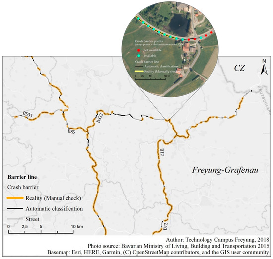 Figure 6 (for crash barriers) and Figure 7 (for fences) are the resulting maps with the georeferenced barrier inventory. The comparison of the automatized classification with the manually checked road sections shows a high correspondence of crash barrier identification and the improving requirements in the case of the fence digitization. The small zoom-in map of Figure 6 presents the advantage of the ANN and GIS combination, as the share of correct identified road sections are increased by using the GIS approach. However, it also shows that the accuracy of the automatic classification still needs to be improved.