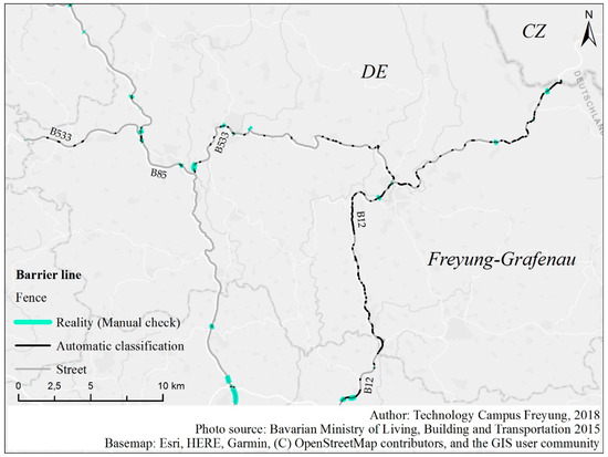 Approximately 20 m is the distance between two image points giving information about the absence or presence of a fence and a crash barrier. To get linear information about the length of both barrier types, features with the attribute crash barrier = 1 (“available”) and fence = 1 are separately selected and converted into lines. Feature points or, rather, image information, which are classified as non-barrier location, are not considered further. The coordinates of each image point belong to the original record point, indeed, and not the next few meters visible in the image, where the barrier may be identified. Nevertheless, the approach is an easy approximation about where a barrier starts and ends, with a minor uncertainty about the exact start and end point.