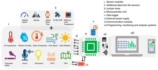 The environmental sensors include air temperature, relative humidity, globe temperature, wind speed, and global solar radiation. A GPS module is used to attain real-world coordinates. The SD card sloth and real-time clock (RTC) are connected to the microcontroller for data logging. The microcontroller’s built-in USB port is used for primary communication. A Wi-Fi module is connected for effortless user-to-device interaction. The main challenges for the hardware are accuracy and reaction time of the sensors and precision of the RTC. The secondary challenge is the enhancement of functionality relevant to the user’s demand. For this purpose, particulate matter and noise pollution sensors are added. Additional data will be extracted from GPS, such as mobility speed, number of satellites in view, and altitude. The implemented components and sensors over the prototyping process are listed in Table 1.