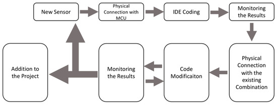 After a successful display of the concept, the MCU is connected with a different set of sensor modules. The prototype evolves step-by-step with the attachment of each component. The process starts with separate tests for each sensor, challenging for relevant outputs owing to connections with the MCU and the available IDE codes. After passing the first test, each sensor and the related code is added in the program. The results are monitored, and the code is further modified to focus on important data and to filter out unnecessary yields. This process is repeated in a loop format until the results fulfill the project’s scope. The prototyping process is further elaborated in Figure 2.