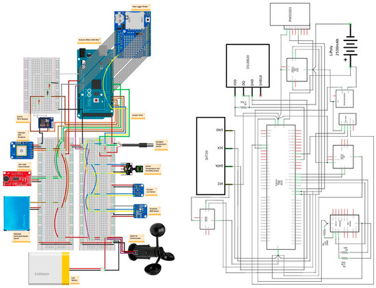 The SEN0170 anemometer’s VDD line is connected to an external 9.6 V DC supply, and the GND is connected to Arduino GND. The same battery powers the MCU when detached from the USB supply source. The data line is attached to an analog pin of the MCU to transmit sensor readings. The PMS5003 particulate matter sensor is attached to the MCU’s universal asynchronous receiver/transmitter (UART); transmitter line (TX) to the receiver (RX1) of the MCU. The rest of the sensor pins are not used in our project. The sound detector (SEN-1462) is also powered from the MCU. The sensor’s gate pin is attached to the MCU for a digital signal, while the envelope transmits analog data. The audio pin remains unused in our project. The GPS module is powered by the MCU’s 5 V supply. The mode of communication is UART by attaching a transmitter line of the GPS to the receiver of MCU and vice versa. The ESP-0 Wi-Fi module connection includes several steps to flush the old firmware and install new firmware through an FTDI serial adaptor. In the absence of an adaptor, a voltage divider is used as the Wi-Fi module is a 3 V device. The module demands a supply current of 300 mA, while the maximum current supplied by the Arduino at 3 V rail is 200 mA. Therefore, an external supply must be used for the ESP-01 module. A voltage divider is used between the RX pin of the ESP and the TX pin of the Arduino as the 5 V logic can fry the Wi-Fi module. The connections are further explained through breadboard diagram and schematics diagram in Figure 3.