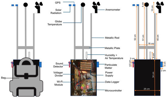 An external shell was made by stacking two rectangular trays and fixing them with screws to protect the electronic circuits. The Arduino MCU, the battery, the data logger, the Wi-Fi module, and the wires are enclosed within this plastic-box. The GPS, RGB (red, green, blue), illuminance, wind speed, and globe temperature sensors are elevated from the box by hollow metallic rods (approx. 50 cm from the box). There is a gap (approx. 8 cm) between the rods to avoid shadows of one sensor on the other. The air temperature plus humidity probe is fastened at the top edge of the casing for data procurement at human shoulder level. The particulate matter sensor and the sound detector are engraved on the top-right and top-left side of the box, respectively. Metallic plates are used to fix the rods on the exterior body. This rectangular package can be placed inside a bag to be carried conveniently by the user. The globe temperature sensor (DS18B20) is enclosed in a blackened table tennis ball. The positioning of the components and the dimensions of the prototype is further explained in Figure 4.