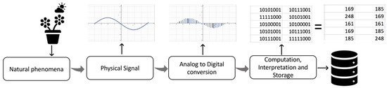 The sampling of an observed physical phenomena and the conversion of the samples into compatible numerical values for computer analysis is called data acquisition. The real-world conditions are measured with fluctuations in electrical signals of certain material in reference to those conditions. By nature, these signals are analog, which is amplified and converted into digital signals. The digital signals are packets of 0 s and 1 s, which are converted into the decimal system by an interpreter. The processed data is stored in the R/W memory of the computer. A simple data acquisition system (DAS) is outlined in Figure 5.