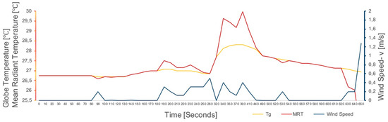 The average temperature of all surfaces that surround a particular point with which it will exchange thermal radiation is called the mean radiant temperature (MRT). The surroundings may include solar radiation and sky temperature in outdoor situations [23]. The MRT can be measured with a globe temperature, air temperature, and wind speed with the following formula [24]: