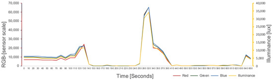 Initially, our study used the above equation in the IDE code for the calculation of radiance from the three primary colors of light. The TCS34725 was used for detection of red, blue, and green bands. Further data included color temperature and illuminance. After overlaying the graphs, it was outlined that the r, g, b readings follow the illuminance pattern (Figure 8). This means the sensor readings and illuminance have a direct relationship.