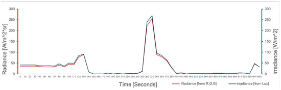 The RGB sensor readings of 0–65535 were distributed into 16-bit segments for each color. After conversion of the r, g, b scale to 8-bits (0–255), the results were similar to the irradiance reading from illuminance through the estimated value of “0.0079 W/m2 per lux” (Figure 9). The reason for slight differences in peak values is considered to be due to the different techniques used for estimation. Also, the scales are for two different units of solar radiation, i.e., radiance in comparison to irradiance.