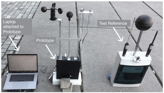 The test was carried out on September 20, 2018, in the courtyard of Technical University of Munich. The devices were fixed to take readings at 4 pm. A computer was connected to the prototype to configure the run-time interims before the test. It was also used to monitor the prototype measurements during the validation. The readings were recorded in ground level and later on the rooftop of the campus. The collection consisted of 97 samples, each taken at 10 s interval. The observers remained approximately 5 m away from the site to minimize the human influence on the data. The setting of the test is shown in Figure 10.