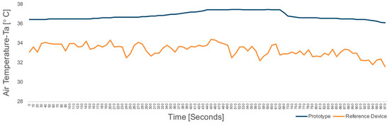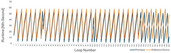 The prototype readings shifted one second earlier in 37th, 103rd, and 166th loop (Figure 22). This detail remained unnoticed in most cases. It was revealed that even by using “micros ()” function, the prototype intervals logged ahead after a few hundred seconds. For the outdoor comfort analysis, this shift of time may not be a huge concern. The runtime comparison showed much stable data logging with the reference device paralleled to a slightly disturbed pattern (glitch) in the prototype.