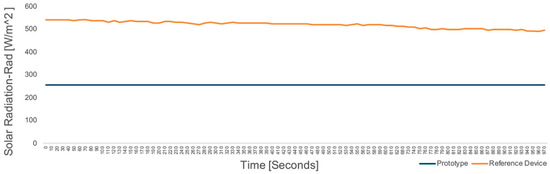 To elaborate, the reference pyranometer recorded between 500 and 560 . On the other hand, the solar radiation readings from the prototype showed a constant 256 values, indicating the maximum limit of the sensor. The result of the test is displayed in Figure 18.