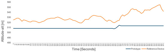 The altitude of the test site on the map is 517 m. The elevation was altered once during the test. The graph from the prototype approves slight inclination from 508.5 to 516.5 m at the third segment of the test. The readings from the reference device appear continuously wavering roughly between 519 to 535 m in the beginning and 530 to 555 m after the level change (Figure 20). Although the change in level shifts was observed by both devices, the readings from the prototype proved to be smoother compared to the reference device.