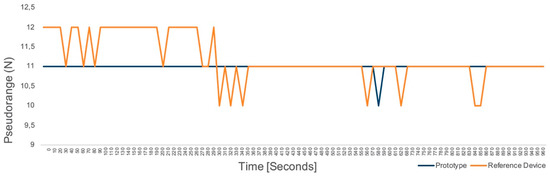 The number of satellites detected by the prototype remained between 10 and 11 without loss of connection. Both devices had a similar performance for discovering the pseudoranges, whereas the reference device detected the maximum pseudoranges (Figure 21).