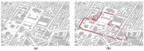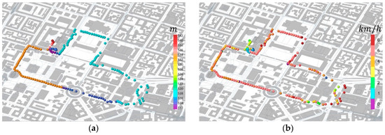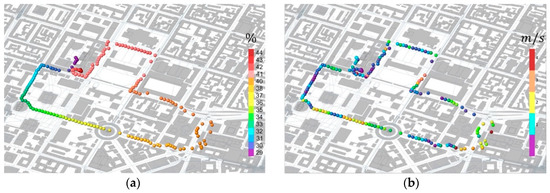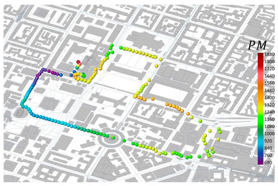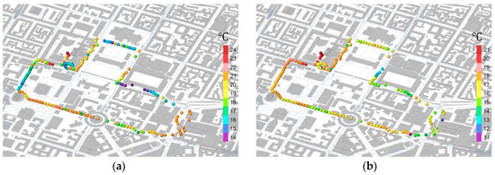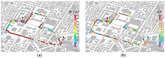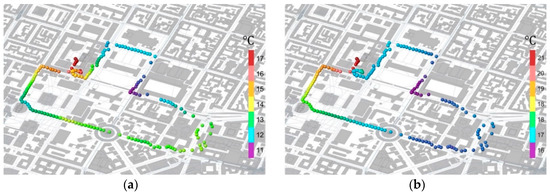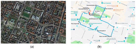 The observation district was Maxvorstadt, Munich. The climate walk route was covered in approximately 35 min. An overview of the selected district is shown in Figure 23. The GPS plot shows precise patterns for geolocation apart from some negligible deviations near the Oscar von Miller Forum. This implies that the GPS readings were accurate enough to ignore the path correction procedures. All the sensor readings were mapped, including the calculations for the MRT and the UTCI (Figure 23, Figure 24, Figure 25, Figure 26, Figure 27, Figure 28, Figure 29, Figure 30 and Figure 31).