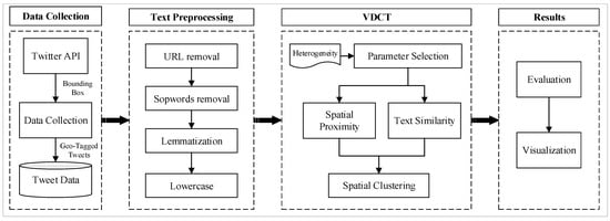 The overall workflow of the proposed approach for event detection from geotagged tweets is illustrated in Figure 1. The process starts with data collection using Twitter Streaming API where geotagged tweets (tweets that include latitude and longitude) are collected and saved. In order to prepare tweets for spatial clustering, text preprocessing is performed to transform tweets’ contents into words which can be used in the following processes. In the clustering step, the proposed clustering algorithm is used to extract spatial clusters from geo-located tweets. Finally, the outputs are evaluated and visualized.