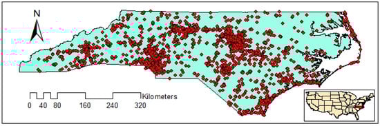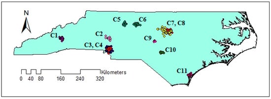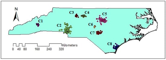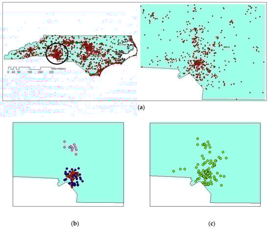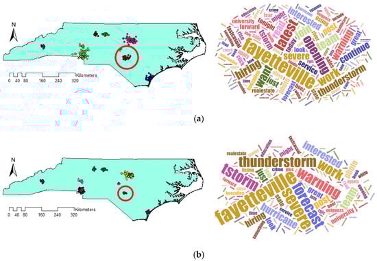 In addition to geotagged tweets, is the only input parameter of the proposed algorithm. The algorithm received 8992 geotagged tweets, related to Hurricane Florence (Section 2.1), while the value of was set to 0.5. The algorithm was able to assign cluster labels to the input tweets. In order to provide a reference for comparison, we also ran a DBSCAN algorithm on the dataset with minPnts = 10 and epsilon = 0.1.