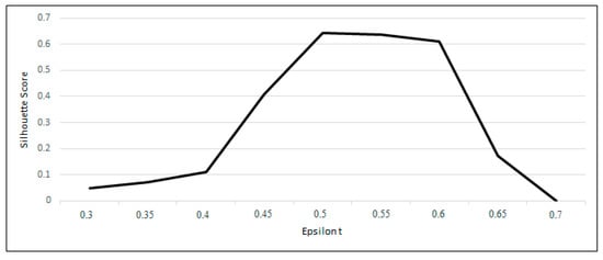 In order to obtain the best value of εt that maximizes the performance of the proposed solution, the model was run with different values of , from 0.3 to 1, and the silhouette scores was calculated for the output results. As it can be seen in Figure 5, the value of 0.5 for results in the highest silhouette score. For the εt value of 0.7, VDCT only extracted one cluster and hence the silhouette score was equal to zero. For the values higher than 0.7, no cluster was detected, and no silhouette score was calculated. Therefore, the value of 0.5 has been chosen for text similarity threshold which is also in line with the best text similarity threshold that was used in the literature [,,,].