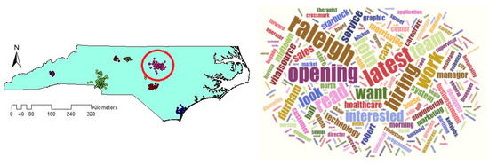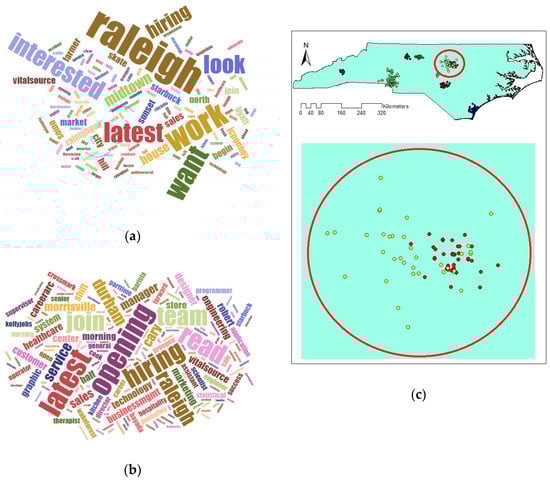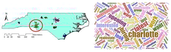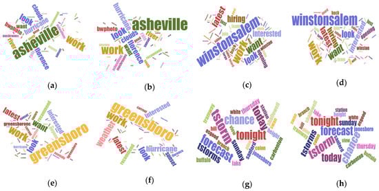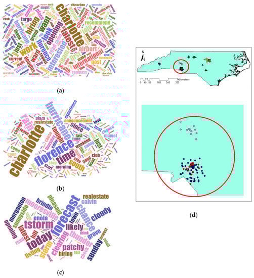 Comparing the size and content of the extracted clusters by the algorithms clarifies that in the areas with less density variation, VDCT and DBSCAN extracted clusters which are almost the same. While in the areas with higher variation in densities, the algorithms perform differently. In these areas, VDCT extracted more clusters with different densities. A part of the study area with higher variation in density is depicted in Figure 8. As it is shown in Figure 8a, by considering different values for , VDCT was able to extract 3 distinct clusters (C2, C3 and C4, Figure 6) while DBSCAN clustered all data of this area into only one group (C2, Figure 7). The Word Cloud of cluster C2 of DBSCAN and clusters C2, C3 and C4 of VDCT are illustrated in Figure 9 and Figure 10a–c, respectively. Word Cloud is a visualization method which displays the frequency and importance of each word in a document by its size. The Word Cloud of VDCT clusters indicates that the proposed algorithm was able to appropriately separate clusters related to the hurricane and other topics. The most frequent words are “forecast”, “tstorm” and “today” in cluster C4, “charlotte”, “Florence” and “hurricane” in cluster C3 and “charlotte”, “opening”, “work” and “hiring” in cluster C2. While all these tweets are clustered together by DBSCAN algorithm. The other clear distinctions between the output clusters are cluster C5 of DBSCAN and C7 and C8 of VDCT. As depicted in Figure 11 and Figure 12, two distinct clusters extracted by VDCT are grouped as a unique cluster by DBSCAN. VDCT separated clusters related to “Raleigh” event and its “Opening”. While DBSCAN clustered all tweets related to “Raleigh” to one group.
