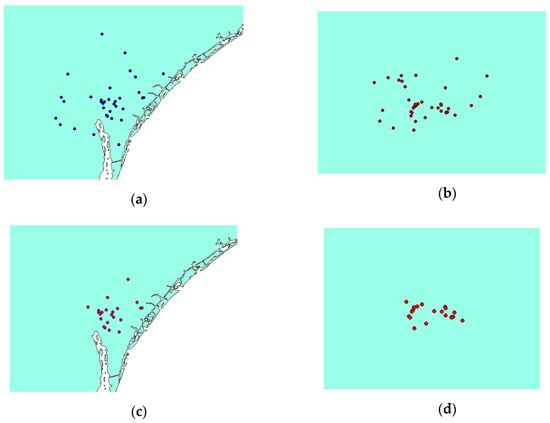 Clusters (a) number 8 of DBSCAN, (b) number 7 of DBSCAN, (c) number 11 of VDCT and (d) number 10 of VDCT.