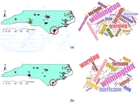 The other crucial issue that should be noticed is the different sizes of output clusters. Figure 13 demonstrates the extracted clusters of algorithms which are located at the same places but with diverse sizes. As clusters are located at the same location, they are indicating the same events. But the extracted clusters by VDCT are smaller than those of DBSCAN. Smaller and more compact clusters seem to be more useful since they provide us with the ability to monitor specific incidents rather than large clusters which may present both the event and the surrounding area. An example is Figure 11, in which VDCT separated tweets relating to “Raleigh” and its “opening” while DBSCAN considered all these tweets as one cluster. Another example is cluster C8 of DBSCAN and C11 of VDCT which their Word Clouds are illustrated in Figure 14a,b, respectively. The extracted Word Clouds and frequent words indicate that both clusters point to the same event which is “hurricane” in “Wilmington”. Having more tweets with irrelevant words to the hurricane, the frequency and importance of words related to hurricane such as “warning”, “flood”, “tornado” are affected by the existence of other words and therefore their sizes are diminished in the Word Cloud of the DBSCAN cluster. However, in VDCT extracted cluster, words such as “warning”, “hurricane”, “flood” and “storm” can be clearly distinguished. It is the same for clusters C7 of DBSCAN and C10 of VDCT which their Word Cloud are illustrated in Figure 15a,b, respectively. The frequent words, “thunderstorm”, “tstorm”, “severe”, “warning” and “forecast” can be quickly recognized in VDCT cluster, while these words cannot be easily identified in DBSCAN cluster as they are affected by other words. The other clusters (C1, C5, C6 and C9 of VDCT and C1, C3, C4 and C6 of DBSCAN) are almost the same for both algorithms as the density of tweets does not significantly vary in these places and their Word Clouds depict the same frequent words in related clusters. The generated Word Clouds of these clusters are illustrated in Figure 16.