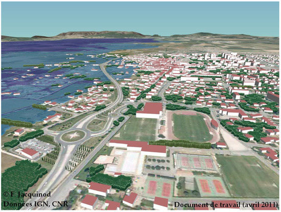 Aerial view from a 3D geovisualization of a district impacted by a simulated flood. Image prepared by F. Jacquinod from data from IGN and CNR.