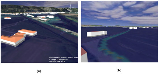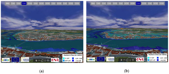 Aerial view from a 3D geovisualization of a district impacted by a simulated flood. (a) and (b) show how water heights were represented, through a 3D transparent volume. Images prepared by F. Jacquinod from data from IGN and CNR.