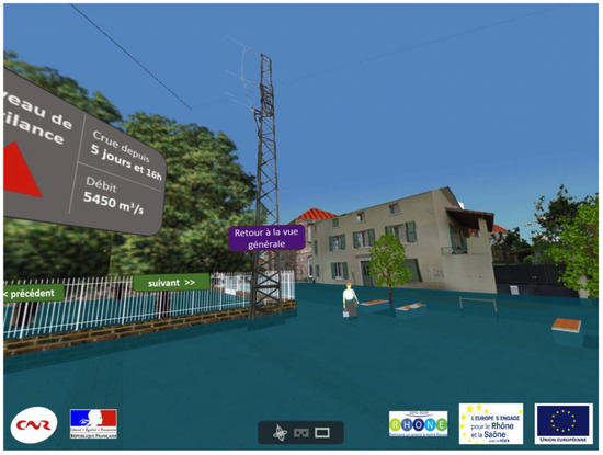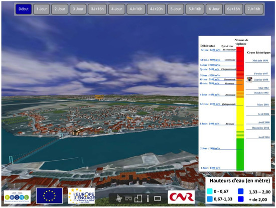 Secondly, designers feel the need to control the restitution of the data in relation to their verisimilitude, so as to be sure that the geovisualizations will not be perceived as a mere video game but as a truthful representation of an existing territory. Moreover, designers want to provide their targeted public (non-expert audience) with the necessary modalities to engage with the representation so as to generate recognition and involvement. In terms of flood mitigation planning, reaching out to citizens is a key issue, and risk managers work hard on producing attractive activities. This is done through figurative simulation and a semiotic organization allowing the consultation and interpretation of contents, that is to say a computerized medium including signs allowing navigation (buttons, timeline, etc.) [57].