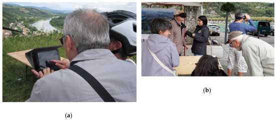 During our last action-research project (2015–2017), researchers in communication studies led an evaluative task throughout the whole duration of the project, from the production to the use of 3D geovisualizations. From a communication studies perspective, 3D geovisualizations are considered as techno-semiotic devices, that is to say an arrangement of objective elements aimed at semiotic and cognitive performance [47,48,49]. As shown in Figure 4, the produced 3D geovisualizations combine iconic, figurative, plastic, linguistic and diagram elements, as well as exogenous documents, such as photographs from previous floods (archives). Figure 6a also highlights the suggested semiotic relationship between the view presented on the tablet screen and the panoramic view from the hill (from where tablets with 3D geovisualizations are consulted). With regard to the virtual reality device, the physical place where the images are viewed (the place in the village) is the same as the one represented virtually: in other words, individuals located in a place see this place transformed by the flood when using the virtual reality headset (Figure 5 and Figure 6b). This second device requires interaction with the interface, but also involves a sensitive dimension in the user experience.