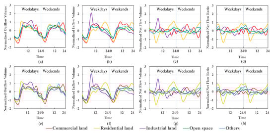Different human activity features can be extracted from the same data source. We regard a journey of passengers as a flow from the pick-up point to the drop-off point; then, the pick-up point and drop-off point can represent the outflow and inflow of the region, respectively. The outflow, inflow, net flow () and net flow ratio () features can be extracted from the taxi trajectory data [43,57]. The construction of the time series is flexible. We can not only aggregate the data into a week or a day [41,42] but also divide a week to obtain greater detail, such as distinguishing human activity patterns on weekdays and weekends [58] and distinguishing human activity patterns on normal workdays, Fridays, Saturdays and Sundays [51]. In addition, the interval of time series can be set as needed, such as 10 minutes or one hour [59,60].