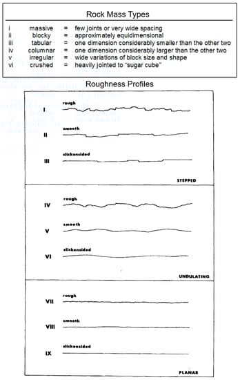 - Barton, N. Suggested methods for the quantitative description of discontinuities in rock masses. ISRM Int. J. Rock Mech. Min. Sci. Geomech. Abstr. 1978, 15, 319–368. [Google Scholar]