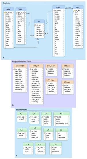 The database also includes six geographic reference tables (Figure 3b) which serve to recover the data regarding the landslides in the inventory of landslide phenomena in Italy (Inventario dei Fenomeni Franosi d’Italia—IFFI [19]), as they are pre-existing landslides. Moreover, it links the recorded information to its territory, by means of the municipality’s ISTAT (Italian National Institute of Statistics) code. Eleven other tables code the specific geological/technical data required by the PARSIFAL method (Figure 3c), such as the type of rock mass, its degree of alteration, the roughness of the profile of the rock surface, the degree of alteration of the rocky material, and the grain size classification of the landslide material.