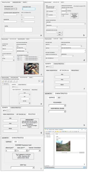 Data acquisition forms: (a) Landslide data recording form where the “Landslide Code” and “GPS Coordinates” fields are automatically filled; (b) “Landslide” tab attributes; (c) Attributes of the “Rock Mass” tab; (d) Attributes of the “Cover” tab for recording cover Quaternary deposits data; (e) “Discontinuities” tab showing the two main form pages “Geometry” and “Characteristics”; (f) Fields of “Set Spacing (m)” tab where minimum, maximum and mean spacing values of a single set of discontinuities can be recorded; (g) Fields of “Persistence” tab where minimum, maximum, and mean persistence values of a single set of discontinuities can be recorded; (h) “Characteristics” tab showing the form pages “JCS” and “Surface” where the “Roughness” and “Weathering Grade” fields are included; (i) “JCS” form page showing the fields to be populating with the joint wall compressive strength test results; (l) “Photo” tab including “Photo Code” showing the image preview and file path.