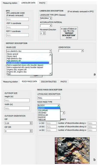 Figure 5. Input forms with combo boxes containing a drop-down list of the geotechnical data values required by the Parsifal method: (a) example of “Grain Size” attributes; (b) example of “Rock Mass Type” attributes.