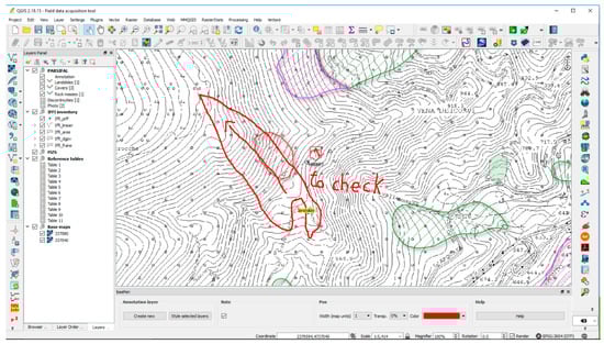 In addition to acquiring data “structured” in tabular form using the survey sheets system illustrated above, mobile GIS, customized with certain plug-ins and other accessory programs, made it possible to capture and manage information that was useful for the final processing. In particular, the BeePen module allowed the digital pen to draw certain notes quickly and directly on the monitor map (Figure 6). In fact, speed is an important requirement in digital fieldwork. In this case, for example, some quick corrections were made to the landslide and outcrop limits that were available from the IFFI mapping (Landslides Catalogue from the “Italian National Geoportal”) or new acquisitions of landslides not surveyed earlier were made, perhaps while entering some indications and comments. These lines were then digitized in a new layer.
