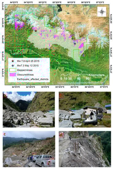 - Gnyawali, K.R.; Maka, S.; Adhikari, B.R.; Chamlagain, D.; Duwal, S.; Dhungana, A.R. Spatial implications of earthquake induced landslides triggered by the April 25 Gorkha earthquake mw 7.8: Preliminary analysis and findings. In Proceedings of the International Conference on Earthquake Engineering and Post Disastor Reconstruction Planning, Bhaktapur, Nepal, 24–26 April 2016; pp. 50–58. [Google Scholar]