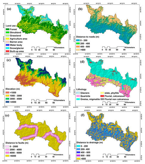 The geological factors in this study are defined as lithology and distance to faults. These geological factors were extracted from the available 1:250,000 geological map of central Nepal. Different lithologic units and proximity to faults play a significant role in controlling the landslides. More than 40% of the lithology of the study area is categorized as gneiss and migmatite. The distance to faults is essential, especially in our case study, since areas closer to the faults were more affected by the earthquake [].