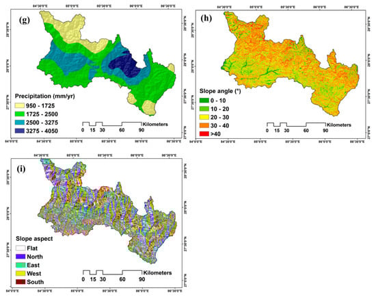 Precipitation and the distance to drainage were our hydrological factors. Drainage is also one of the causal factors of the landslides because they cause erosion and saturation of the materials in the lower parts of valleys [,].